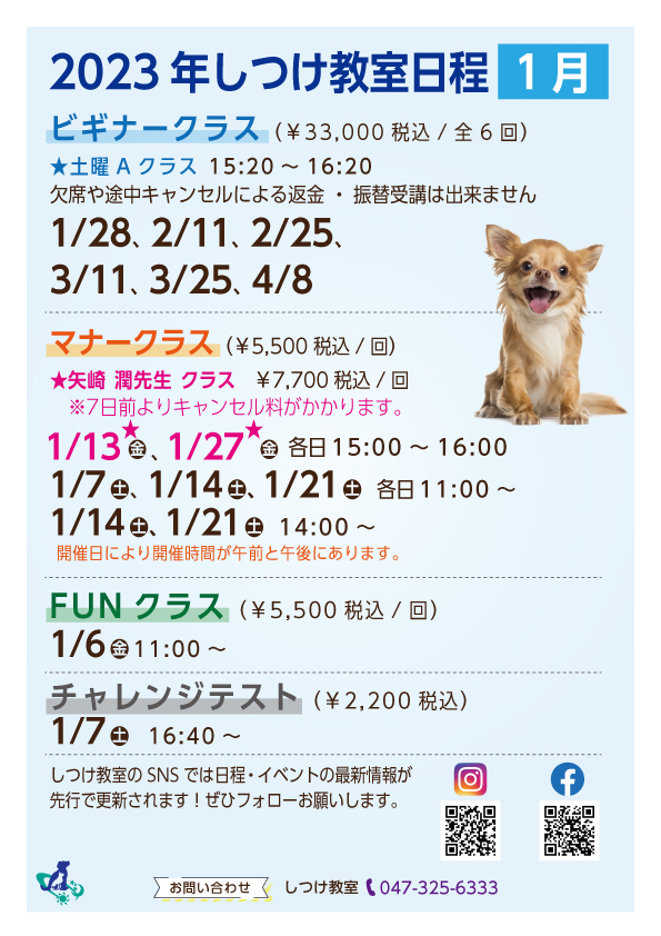 1月のしつけ教室のお申込み・お問い合わせは下記にお電話ください♪